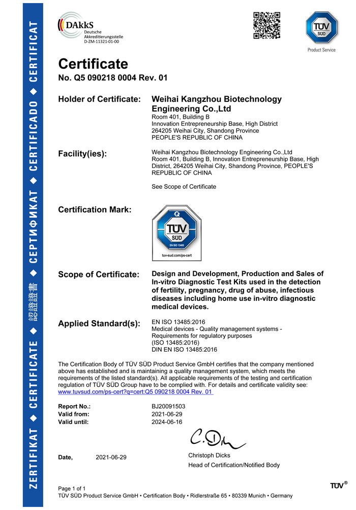 ? ? ?威海康州生物工程有限公司成立于2013年,公司坐落于風(fēng)景秀麗的海濱小城——威海市??抵萆锸羌邪l(fā)、生產(chǎn)和銷售于一體的生物科技公司,與威海哈爾濱工業(yè)大學(xué)合作研發(fā)團(tuán)隊(duì),擁有先進(jìn)的科研基地及生產(chǎn)基地。主要從事快速診斷檢測(cè)產(chǎn)品的研發(fā)、生產(chǎn)、銷售。產(chǎn)品涵蓋:生育檢測(cè)、藥物濫用檢測(cè)、農(nóng)藥殘留檢測(cè)以及其他臨床診斷檢測(cè)等。公司自主研發(fā)生產(chǎn)得早早孕試紙,排卵檢測(cè)試紙,毒品檢測(cè)及疾病檢測(cè)等醫(yī)用產(chǎn)品,經(jīng)過(guò)歐盟認(rèn)證,產(chǎn)品質(zhì)量穩(wěn)定,值得信賴。